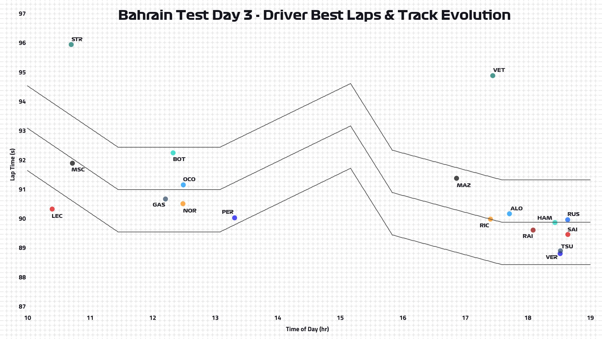 The graph above shows when the drivers set their best lap times on Day 3. The lines are like contour lines on a map (which show places of equal height) - these show equivalent lap time for the time of day. For example, while Perez’s lap was slower than Verstappen’s, if you account for track conditions it was virtually identical.