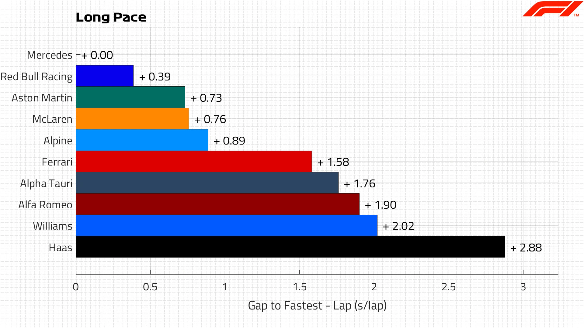 However, they have reason to be cheerful about their race pace, based on the programme they could complete, as they ended up third in the long run pace rankings (below), just 0.73s per lap slower than the Silver Arrows, with whom they have a very tight technical relationship.