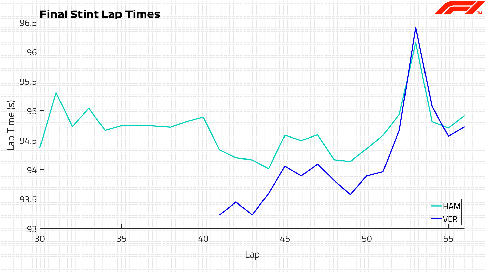 During the final three laps, the pace difference between the drivers converged, with Verstappen having an average lap time just 0.03s quicker than Hamilton.