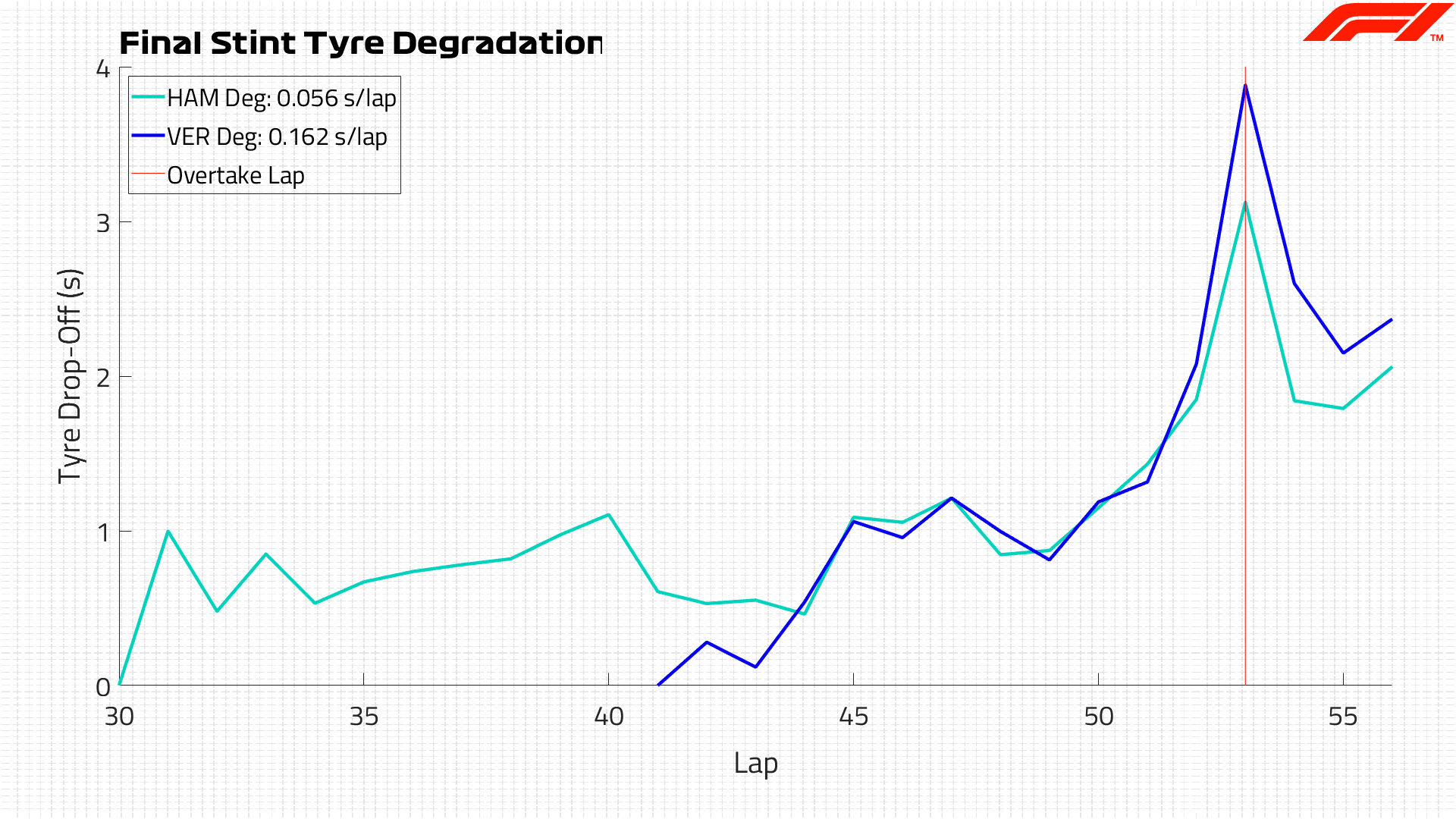 Crucially, on lap 53 - the lap that Verstappen passed Hamilton - both drivers were roughly equal on overall tyre degradation. After giving the position back for exceeding track limits, Verstappen was now at a disadvantage, having used more of his tyre’s performance than Hamilton at this stage.