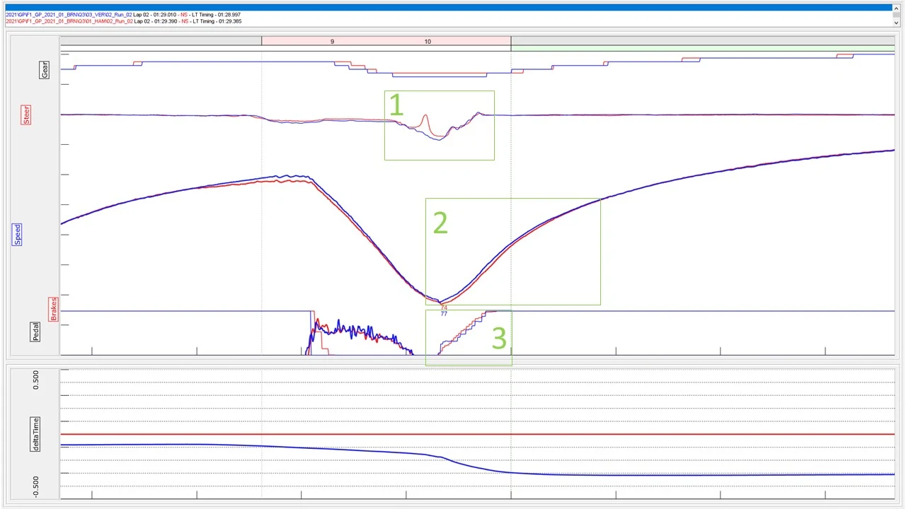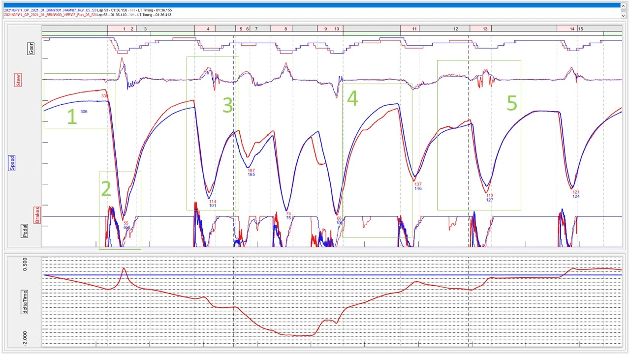 1. Both drivers are equal up to Turn 4, but Verstappen, with his tyre advantage, carries more speed into the corner and gains several tenths going into the high-speed section.
