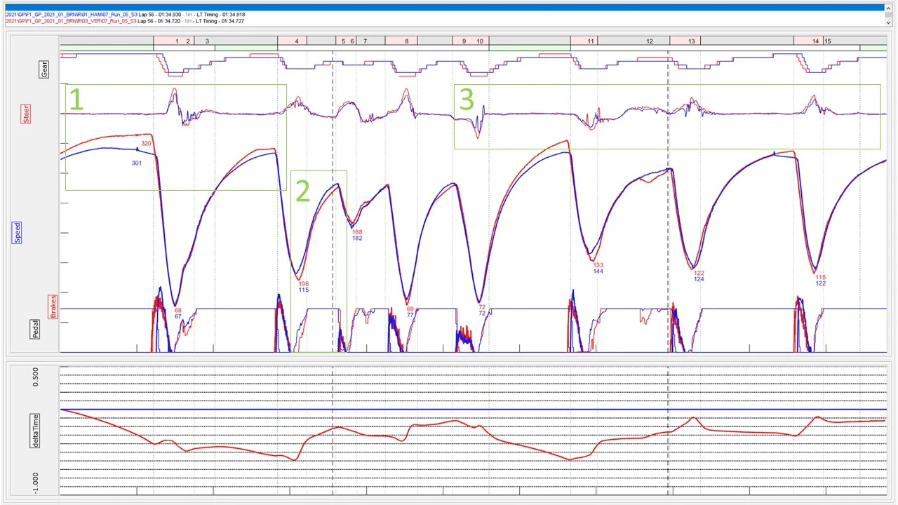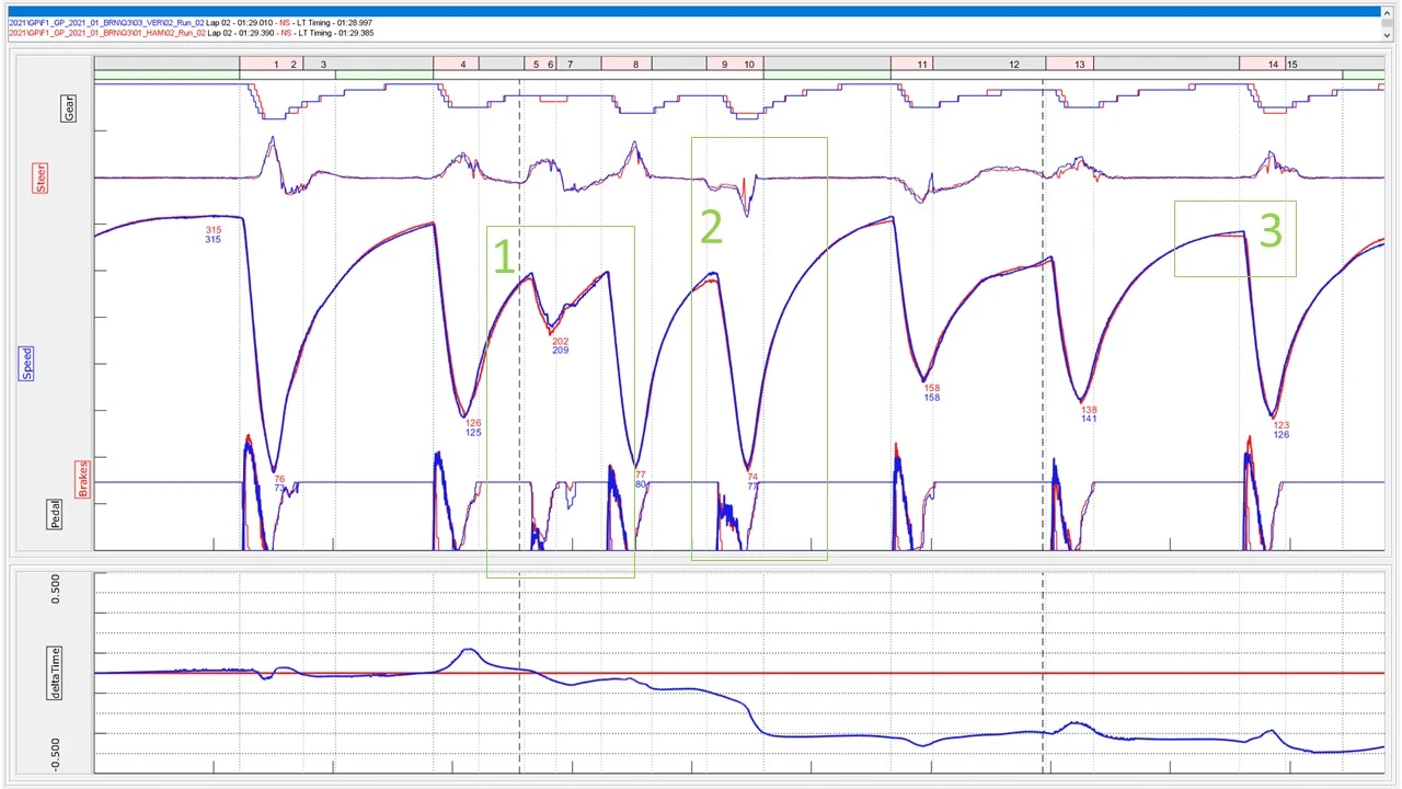 1. As seen in Practice, Verstappen once again carries more speed into Turn 5, but has to compromise in Turn 7 by lifting more. However, overall Verstappen gained time relative to Hamilton in this section.