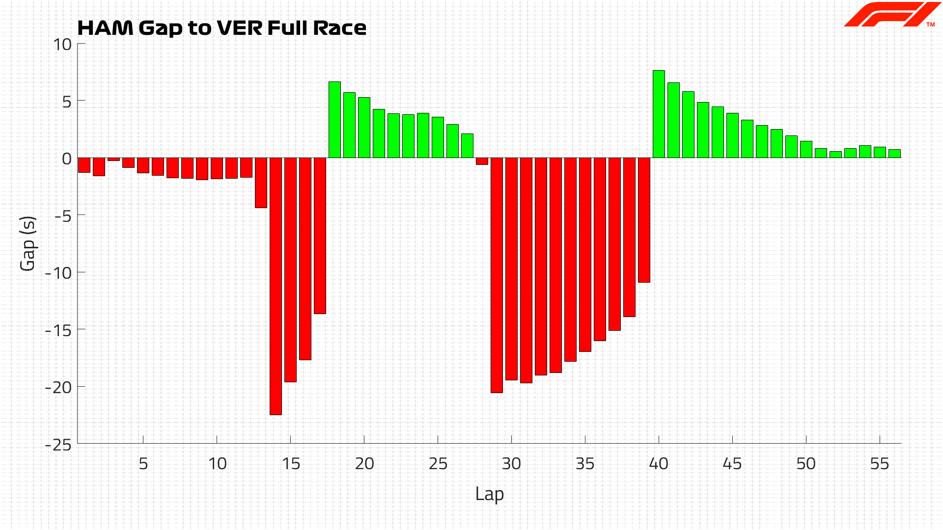 The chart below shows Hamilton’s gap to Verstappen across the race, the red bars being his deficit and the green his lead.
