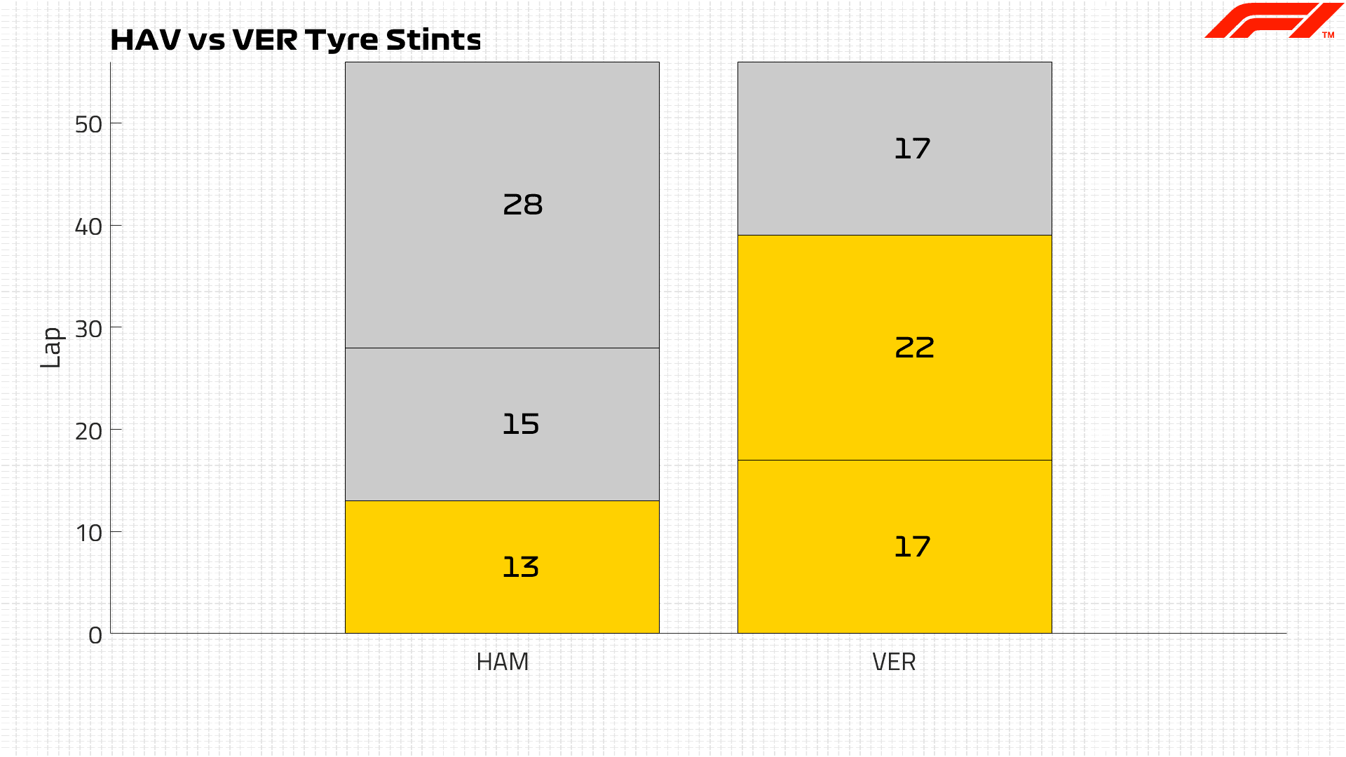 With Hamilton making his second stop 11 laps earlier than Verstappen, tyre management was key to retaining the lead. His last stint on the hard tyre was 28 laps long, with Lance Stroll being the only other driver in the Top 10 to complete this many laps.