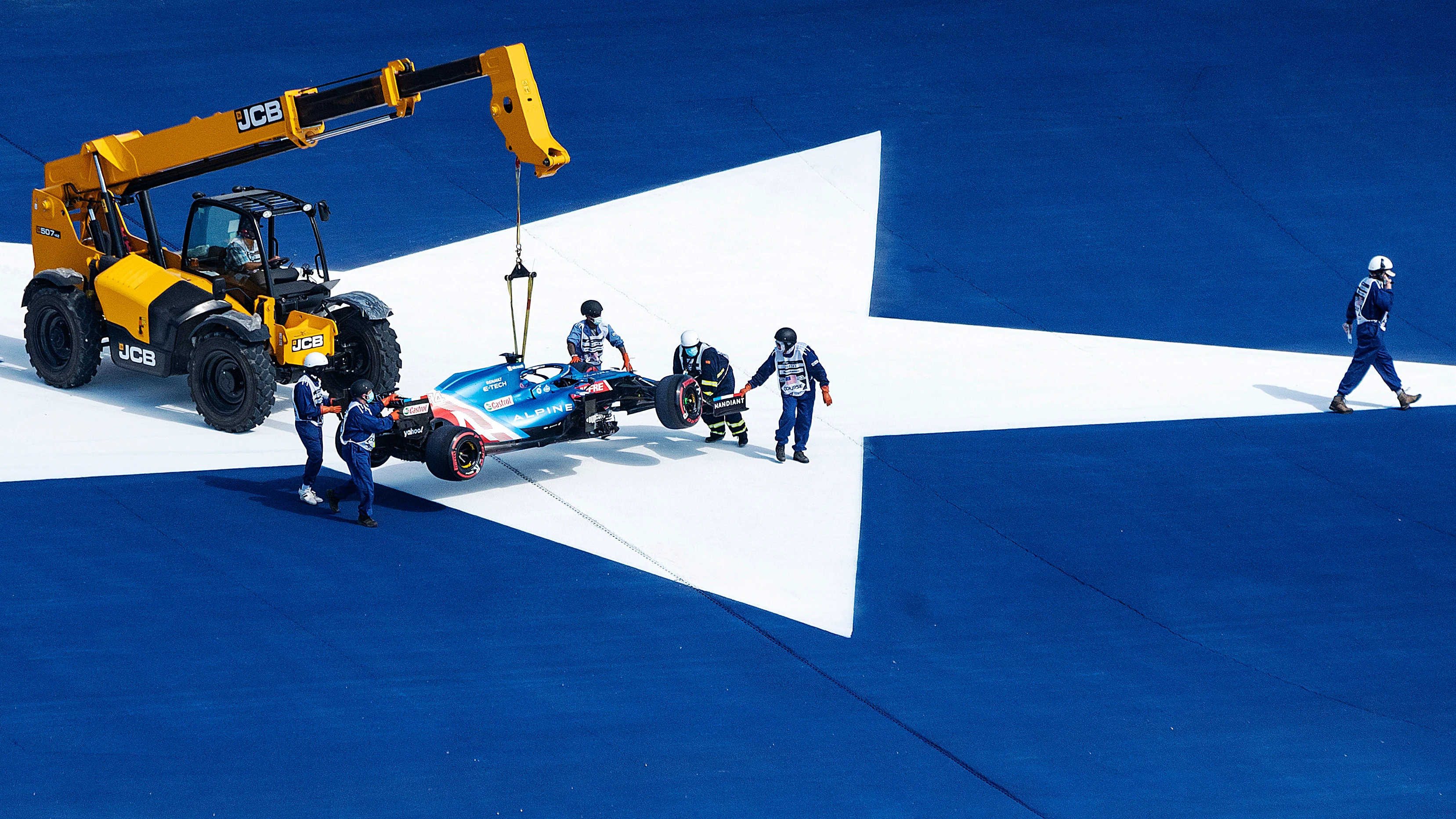 Alonso was on his out lap in the opening practice session when he stopped at Turn 12, bringing out the red flags while the car was cleared. Alpine managed to repair a water system issue for him to return to the track later in FP1 but as Alonso struggled with the balance of his car he ended up with a big spin at the penultimate corner in the second session, hitting the barrier with his rear wing.