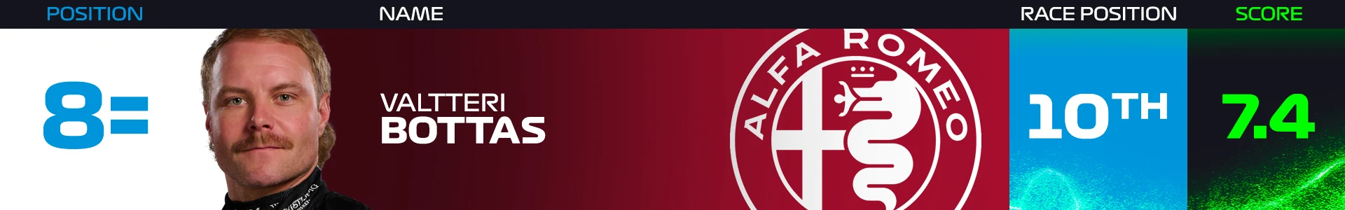At a track where Alfa Romeo did not expect to be at their strongest, Bottas made it into Q2, before qualifying 14th, extracting the maximum from his C43 to score a much needed point for his team.