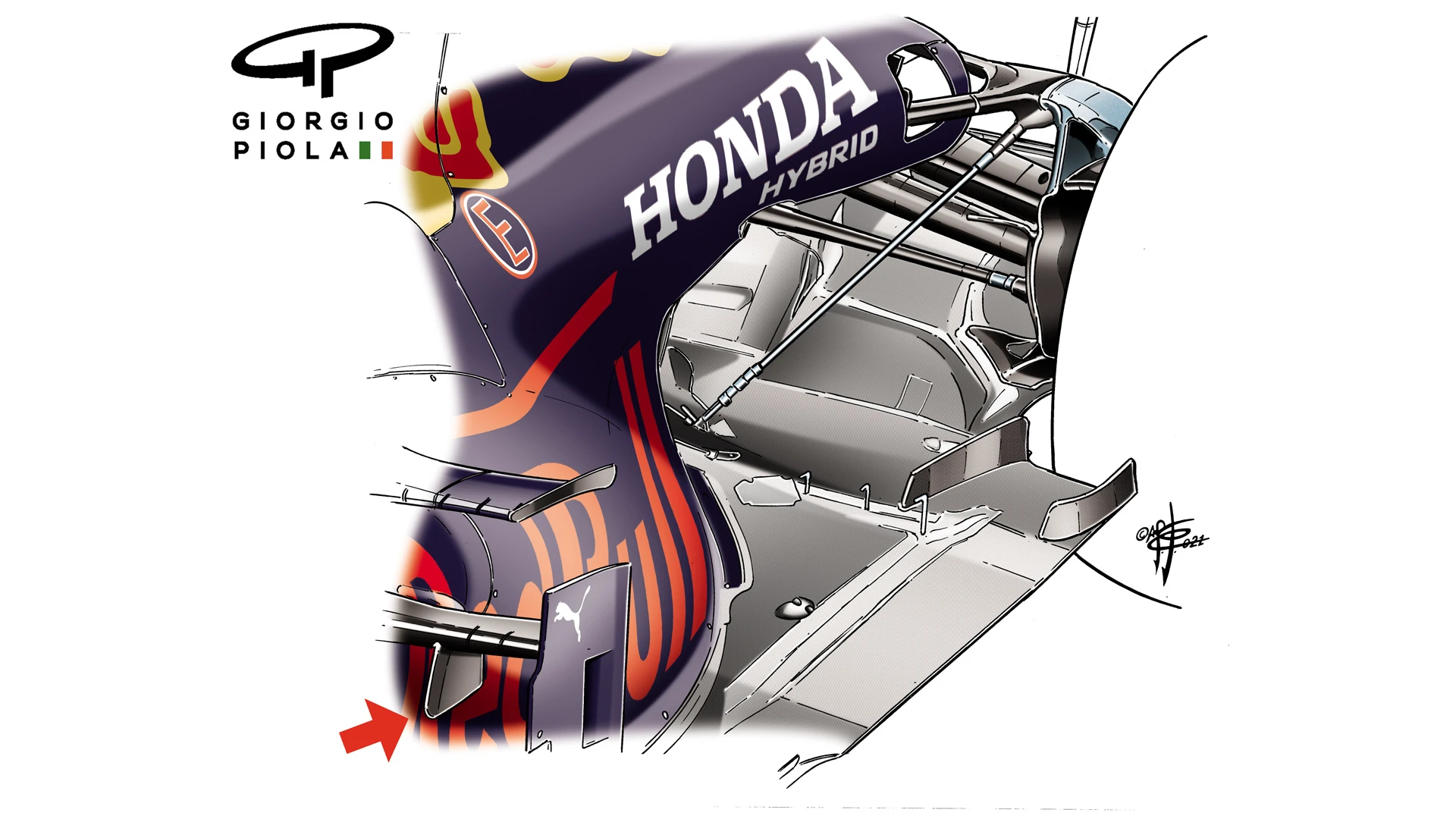 Red Bull have this year has taken a leaf out of Mercedes’ 2020 book and also sought to sweep the rear suspension back – but have been restricted in how to do this by the '21 development token spend restriction. Nonetheless it’s believed they have managed an ingenious way of doing so while retaining the same mounting points.