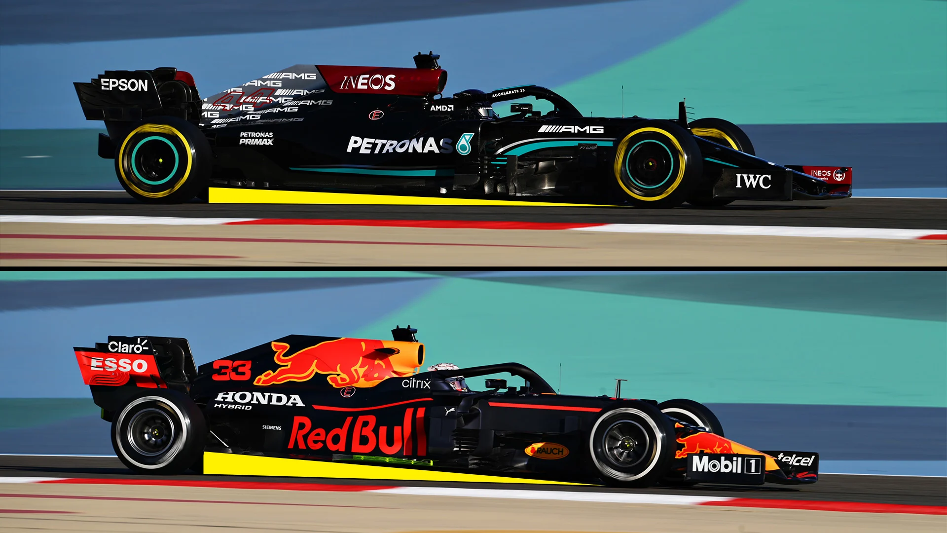 The Red Bull RB16B, with its higher-rake design, is recognised as having a higher downforce ceiling than the lower-rake Mercedes W12.